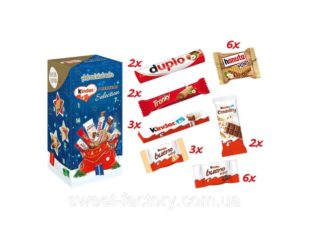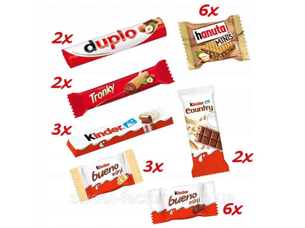 Obsah: Kinder Riegel, Kinder Country, Kinder Bueno Mini, Duplo, Hanuta Mini, Tronky, Kinder Bueno White.