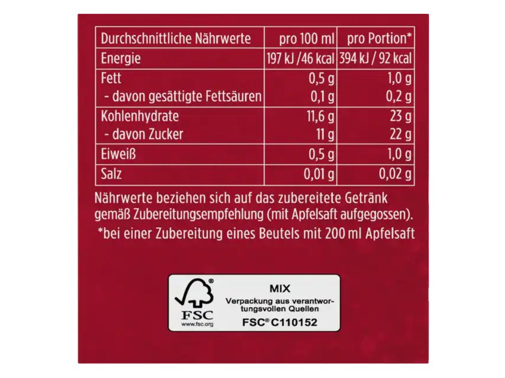 - ☕ Zalijte sáček 200 ml horkého jablečného nebo hroznového moštu a nechte 10 minut louhovat.