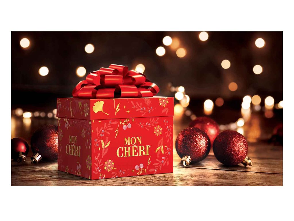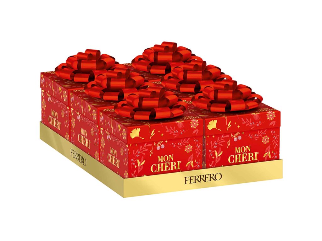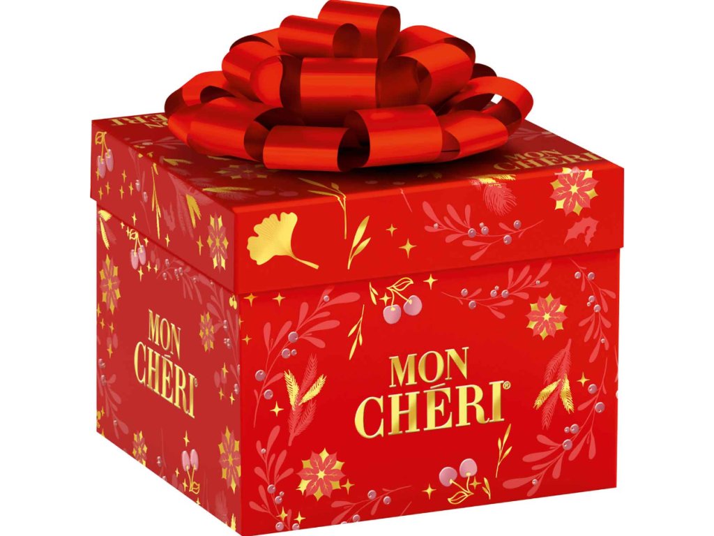 Výrazná červená krabička se zlatými detaily a ozdobnou mašlí působí luxusně a nadčasově. Ať už obdarováváte partnera, rodiče, kolegu nebo přátele, Mon Chéri je jistota dobrého vkusu – decentně dospělá, neokoukaná a vždy vítaná. Motiv obalu se může lišit, radost však zůstává stejná.