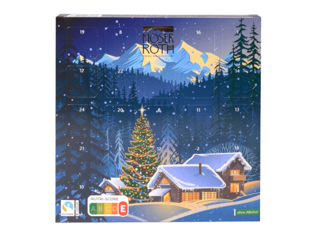 Představte si zimní večer, tichý les a světla vánočního stromečku v horské chalupě… Přesně takovou atmosféru navodí noční edice adventního kalendáře Moser Roth, která v sobě spojuje prémiovou čokoládu, elegantní design a kouzlo očekávání. Za každým z 24 okének se ukrývá ručně vyráběná mini pralinka bez alkoholu, vytvořená z výběrové bílé, mléčné a hořké čokolády. Tento kalendář je dokonalým dárkem i sladkou odměnou pro každý den v prosinci.