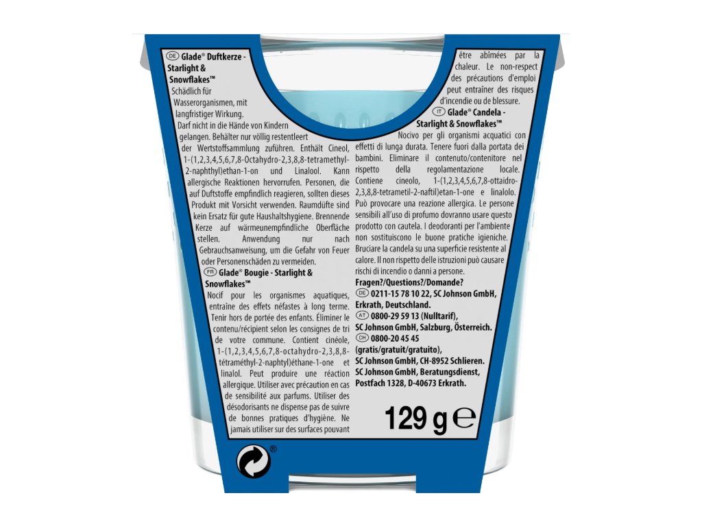 Glade by Brise vonná svíčka Starlight & Snowflakes 129 g je ideálním doplňkem pro každý prostor, který si chcete přetvořit na útulnou oázu klidu a pohody. Tato limitovaná edice přináší univerzální zimní vůni, která je kombinací jemných a svěžích vůní sněhu a zimních večerů. Vonné svíčky Glade jsou navrženy tak, aby přinášely nejen příjemný vůně, ale také atmosféru, která zklidní vaše smysly a provoní každý kout vašeho domova.