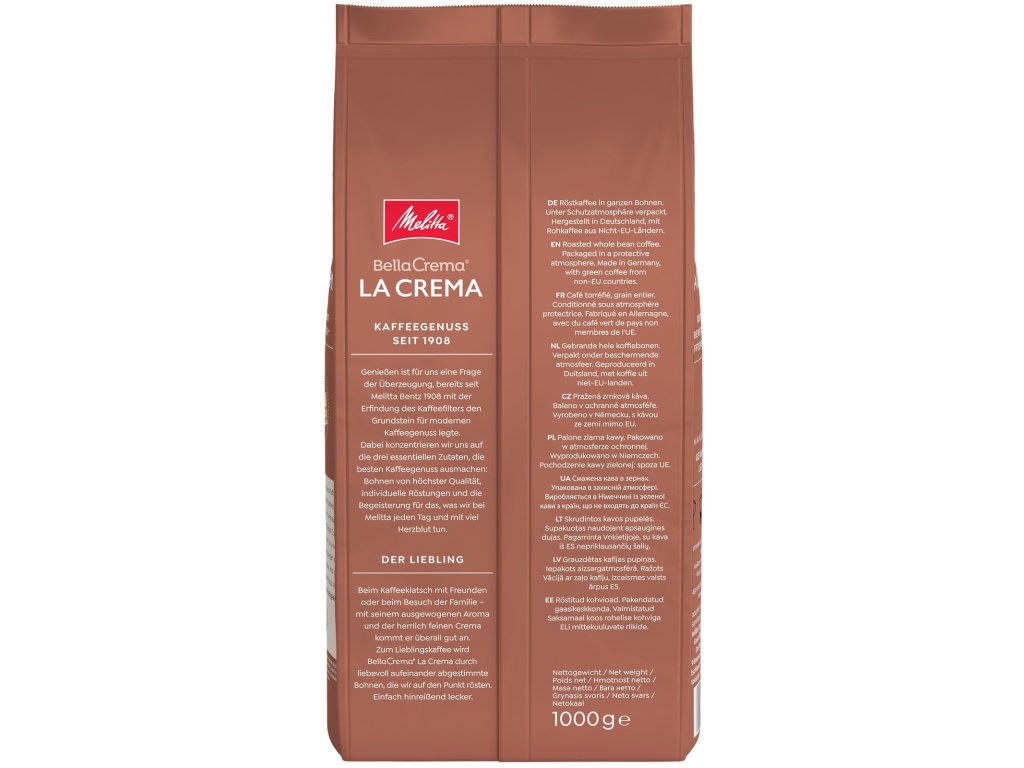 Melitta je synonymem pro kvalitní kávu již od roku 1908, kdy Melitta Bentz vynalezla první kávový filtr a tím položila základ moderní kultuře pití kávy. Značka je dnes symbolem německé tradice, inovací a nekompromisní kvality. Všechny produkty Melitta jsou vyráběny s důrazem na detail, čerstvost a chuťový zážitek – a právě BellaCrema La Crema je toho skvělým důkazem.