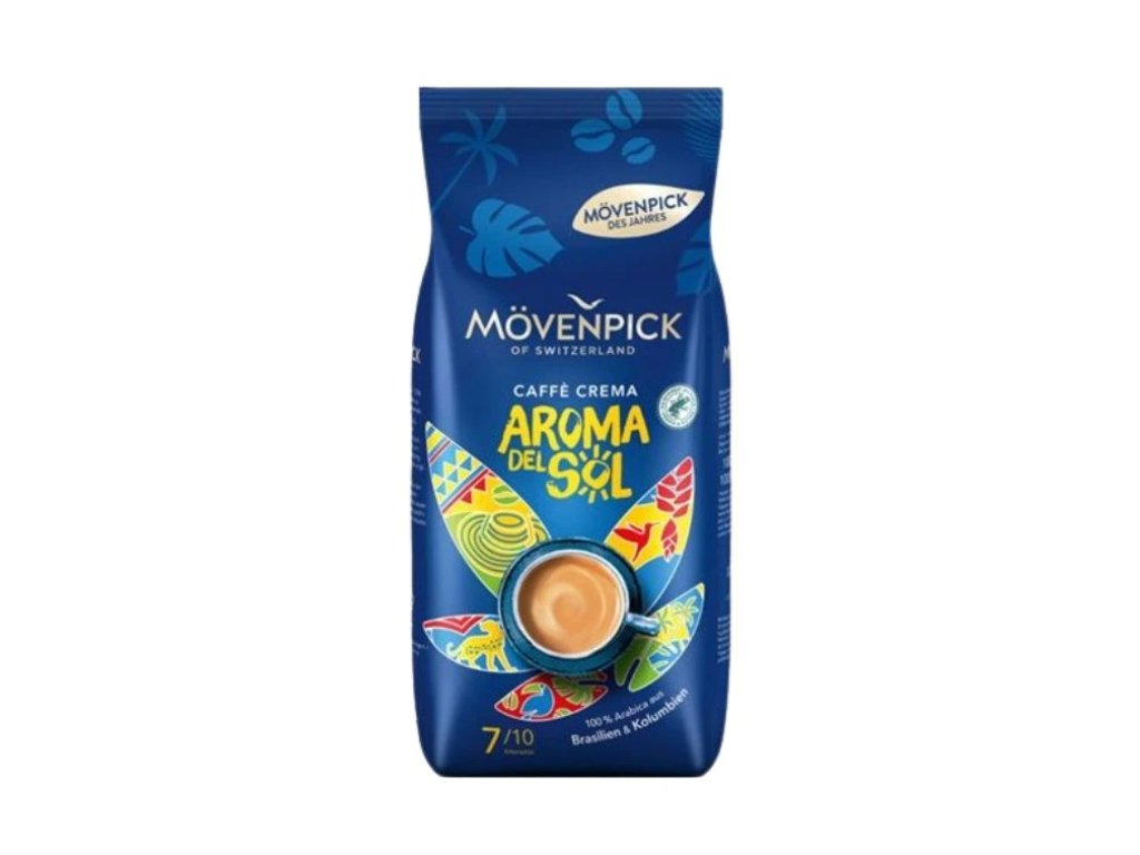 Limitovaná edice prémiové kávy Mövenpick z 100% arabiky z Brazílie a Kolumbie. Aroma del Sol nabízí harmonickou chuť s tóny čokolády a lískového oříšku, střední pražení a nízký obsah kofeinu. Rainforest Alliance certifikace, švýcarská kvalita.