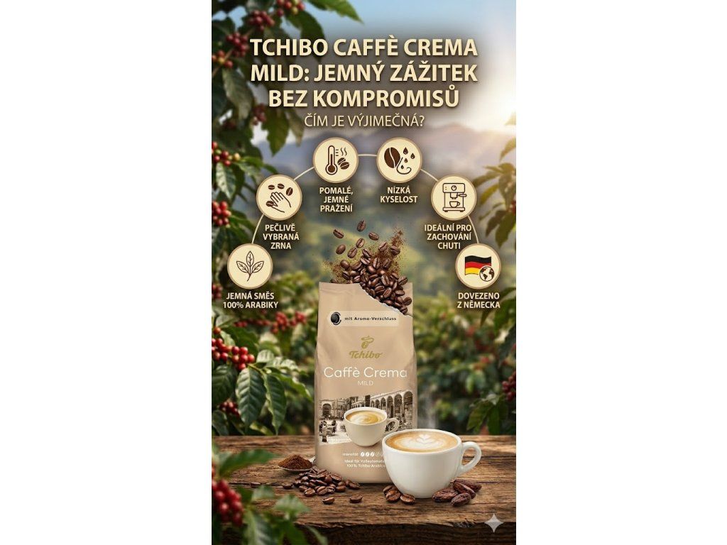 Tchibo Caffe Crema Mild je vysoce kvalitní zrnková káva nabízená společností Tchibo. Tato káva je charakteristická svou jemnou a vyváženou chutí, která je ideální pro ty, kteří preferují mírnější kávu s jemným aroma.