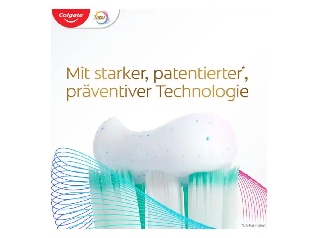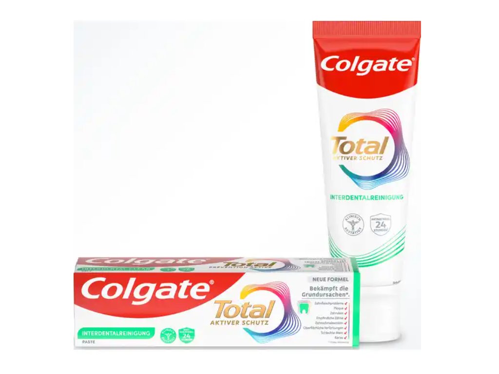 Colgate Total Plus Interdental je zubní pasta nové generace, která díky milionům mikročástic efektivně odstraňuje plak i z těžko přístupných míst, jako jsou mezizubní prostory nebo linie dásní. Poskytuje komplexní ochranu celého ústního prostoru – zubů, jazyka, dásní i tváří – a to až na 12 hodin po 4 týdnech pravidelného používání.