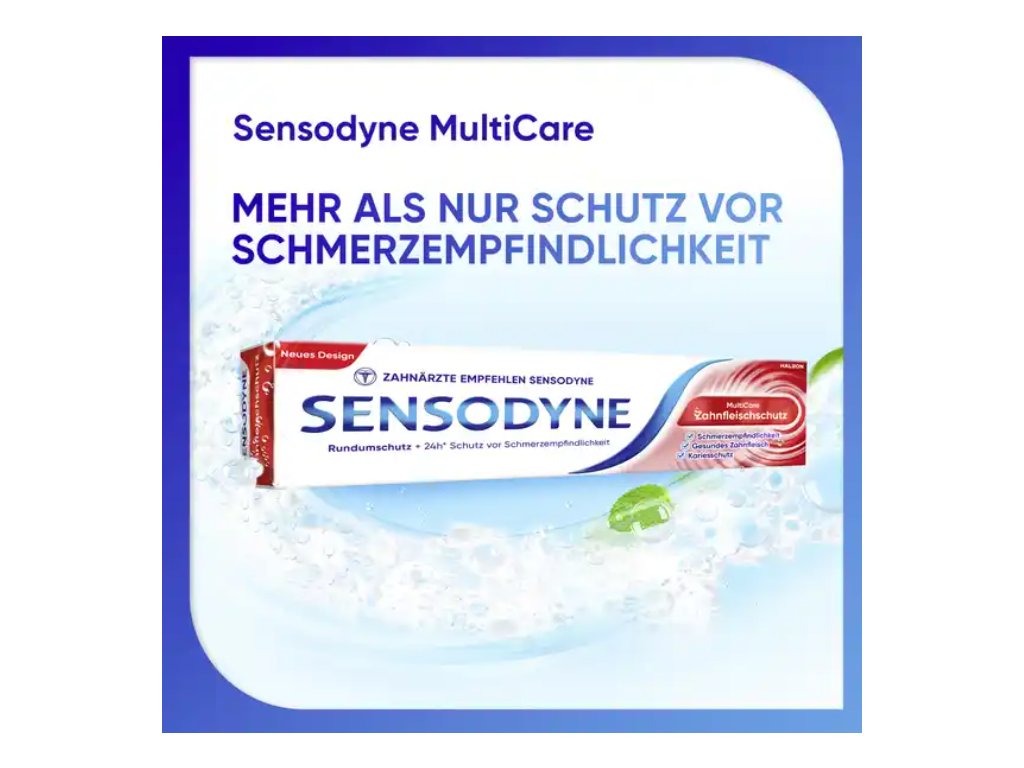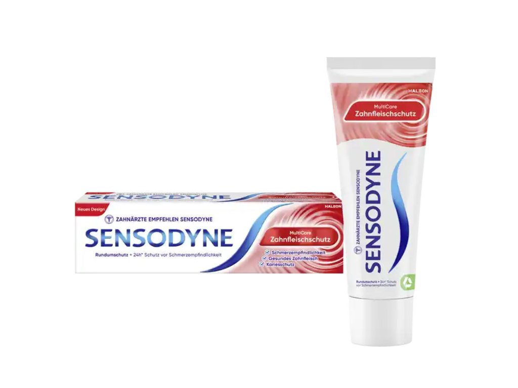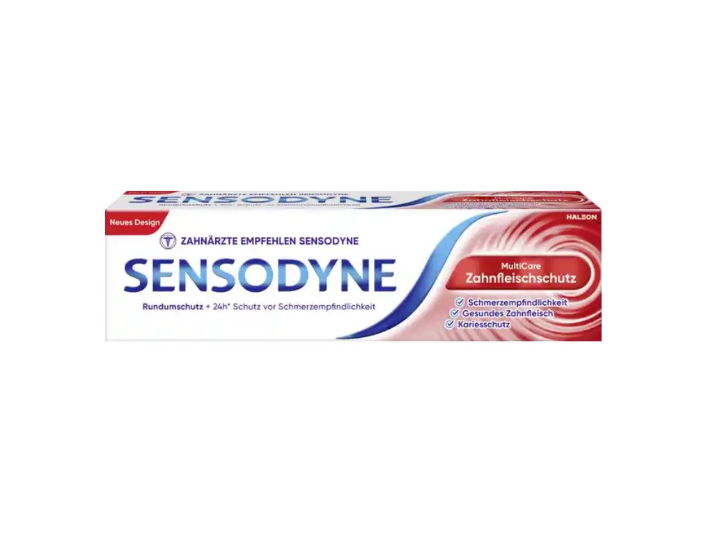 Citlivost zubů a problémy s dásněmi jdou často ruku v ruce. Sensodyne MultiCare na to reaguje komplexně – zklidňuje podrážděné zubní nervy, zlepšuje stav dásní a poskytuje spolehlivou ochranu před zubním kazem. Obsahuje fluorid sodný (1450 ppm), který posiluje zubní sklovinu. Je určen pro každodenní použití – ať už vás trápí mírná citlivost, nebo hledáte prevenci v péči o ústní dutinu.