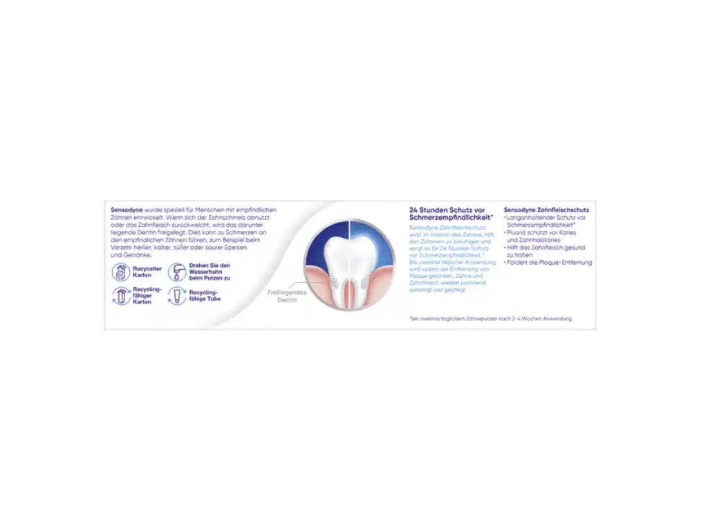 Trápí vás citlivé zuby nebo krvácení dásní při čištění? Sensodyne MultiCare Zahnfleischschutz je zubní pasta, která spojuje komplexní péči o citlivé zuby i zdraví dásní v jednom účinném složení. Díky obsahu dusičnanu draselného působí na citlivé zubní nervy a pomáhá snižovat bolestivou reakci na studené, horké nebo sladké podněty. Zároveň díky antibakteriální složce redukuje zubní plak, a tím pomáhá udržet dásně silné a zdravé – ideální kombinace pro každodenní péči.