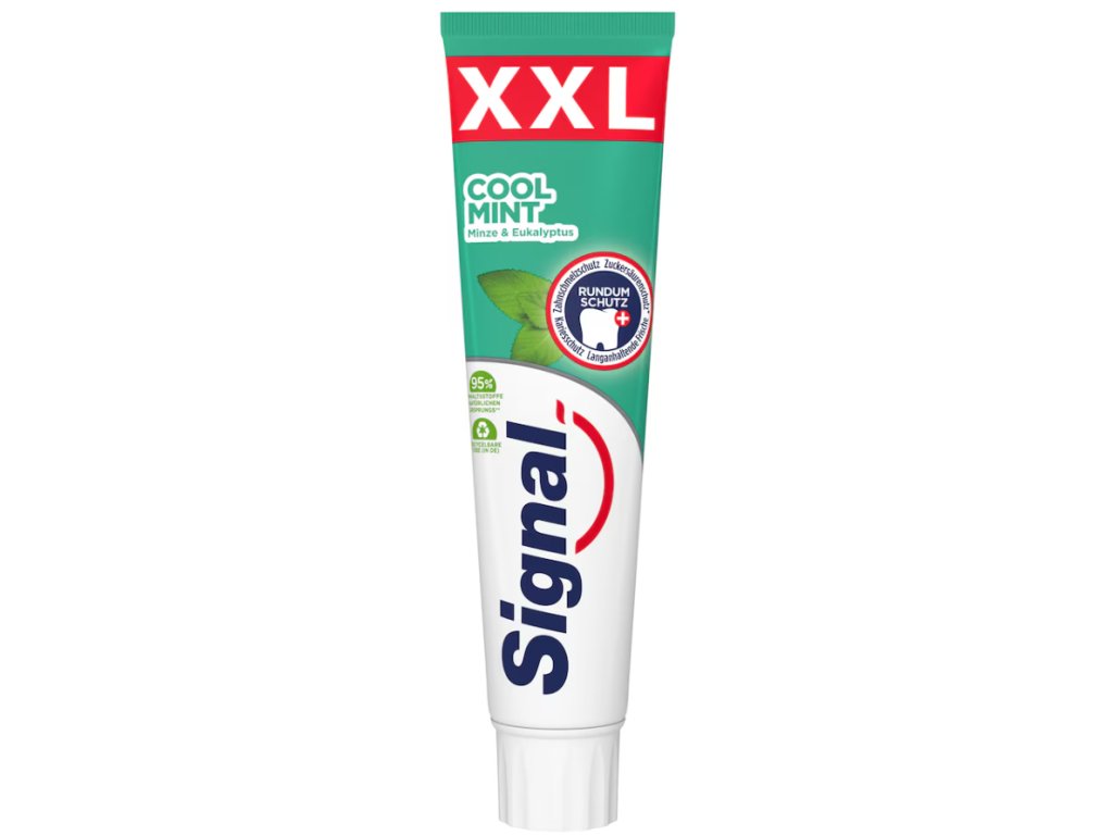 Signal Cool Mint XXL kombinuje osvěžující sílu mátového a eukalyptového oleje s účinnou ochranou proti zubnímu kazu. Díky obsahu fluoridu a přírodního kalcia zajišťuje remineralizaci zubní skloviny a dlouhodobou ochranu před zubním kazem a skrytými cukernými kyselinami. S každým čištěním poskytuje intenzivní pocit čistoty a svěží dech, který vydrží po celý den.